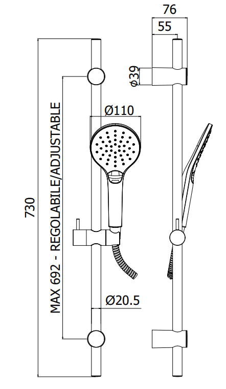 La doccetta inclusa è dotata di un comodo saliscendi che ti permette di regolarne l'altezza in base alle tue preferenze personali. Inoltre, il flessibile lungo 150 cm ti offre la libertà di movimento necessaria durante la doccia.