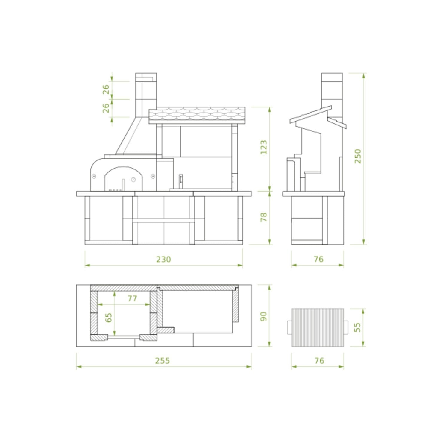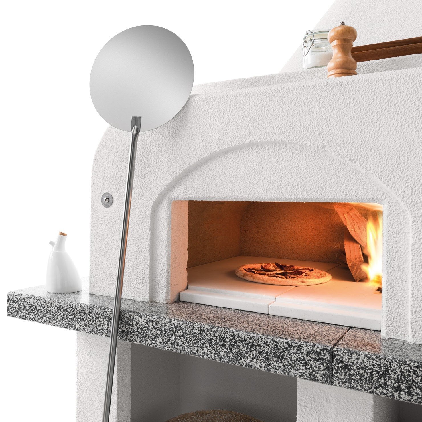 Il modello include un forno a legna Easy Medium in refrattario, con vano interno di 77x65 cm, e un piano di cottura conforme al regolamento (CE) n.1935/2004, idoneo al contatto con gli alimenti. La portina del forno in acciaio inox è dotata di un comodo termometro e di una maniglia antiscottatura.