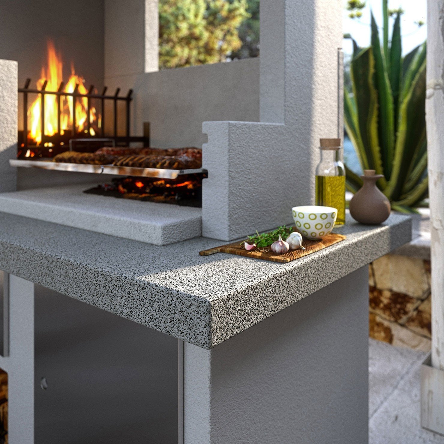 Il piano di lavoro in Marmotech levigato effetto granito grigio dona al barbecue un aspetto elegante e resistente. La struttura, realizzata in conglomerato cementizio, può essere tinteggiata per adattarsi al tuo stile personale.