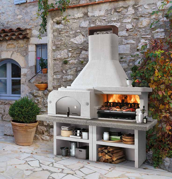 Il barbecue comprende anche un braciere portalegna da 76 cm in metallo verniciato, una sottocappa metallica per proteggere la cappa dal calore dei fumi di combustione e una griglia cottura Bio in acciaio inossidabile da 76x37 cm con manici in bachelite. Il piano di lavoro è realizzato in Marmotech levigato con un affascinante effetto granito grigio.