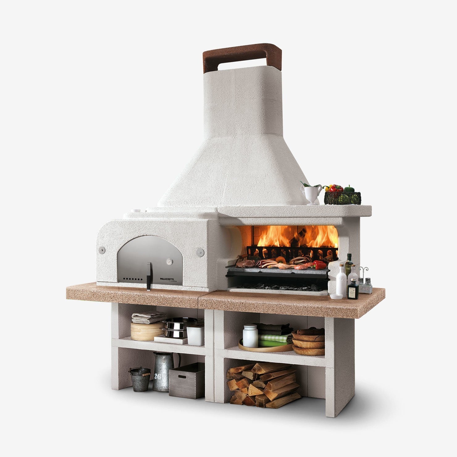 Il barbecue comprende anche un braciere portalegna da 76 cm in metallo verniciato, una sottocappa metallica per proteggere la cappa dal calore dei fumi di combustione e una griglia cottura Bio in acciaio inossidabile da 76x37 cm con manici in bachelite. Il piano di lavoro è realizzato in Marmotech levigato con un affascinante effetto granito rosso.