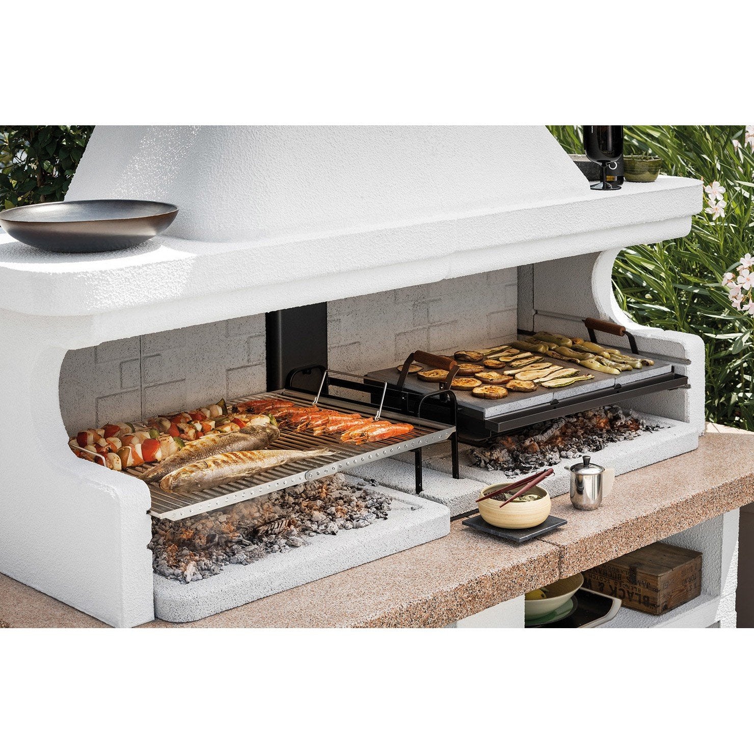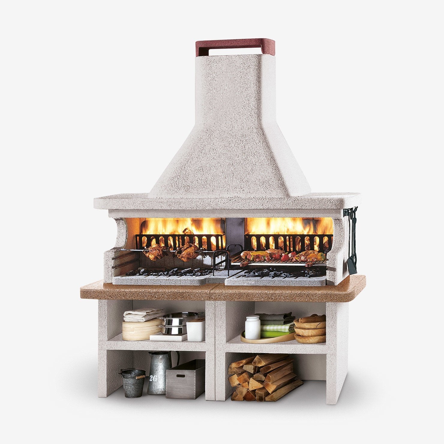 Le due aree grill presentano un piano fuoco in refrattario e un materassino isolante, che garantiscono una distribuzione uniforme del calore e un'ottima resa di cottura. I due cassetti cenere con Sistema Fast-Fire Box favoriscono la circolazione dell'aria, migliorando la combustione e facilitando la pulizia una volta che il fuoco è spento.