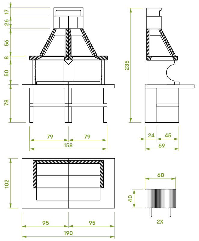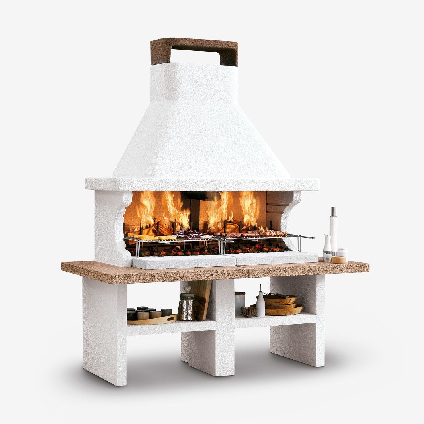 Il barbecue dispone anche di due bracieri portalegna in acciaio verniciato autoportanti, che facilitano la gestione del combustibile e consentono una combustione efficiente. Le sottocappe metalliche proteggono la cappa dal calore dei fumi di combustione, garantendo una maggiore durata nel tempo.
