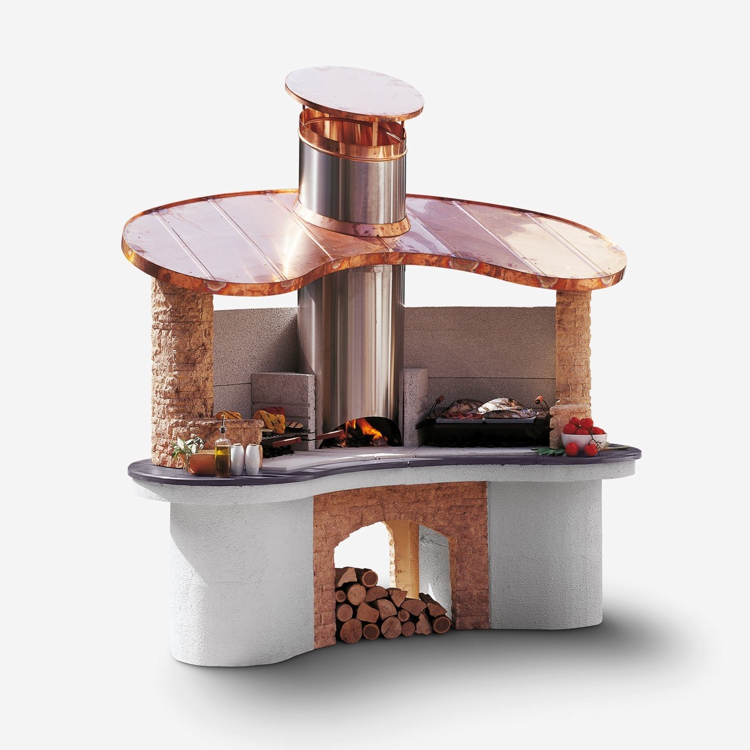 Palazzetti Sumatra barbecue con cappa in rame inserti in pietra e piano d'appoggio color ardesia
