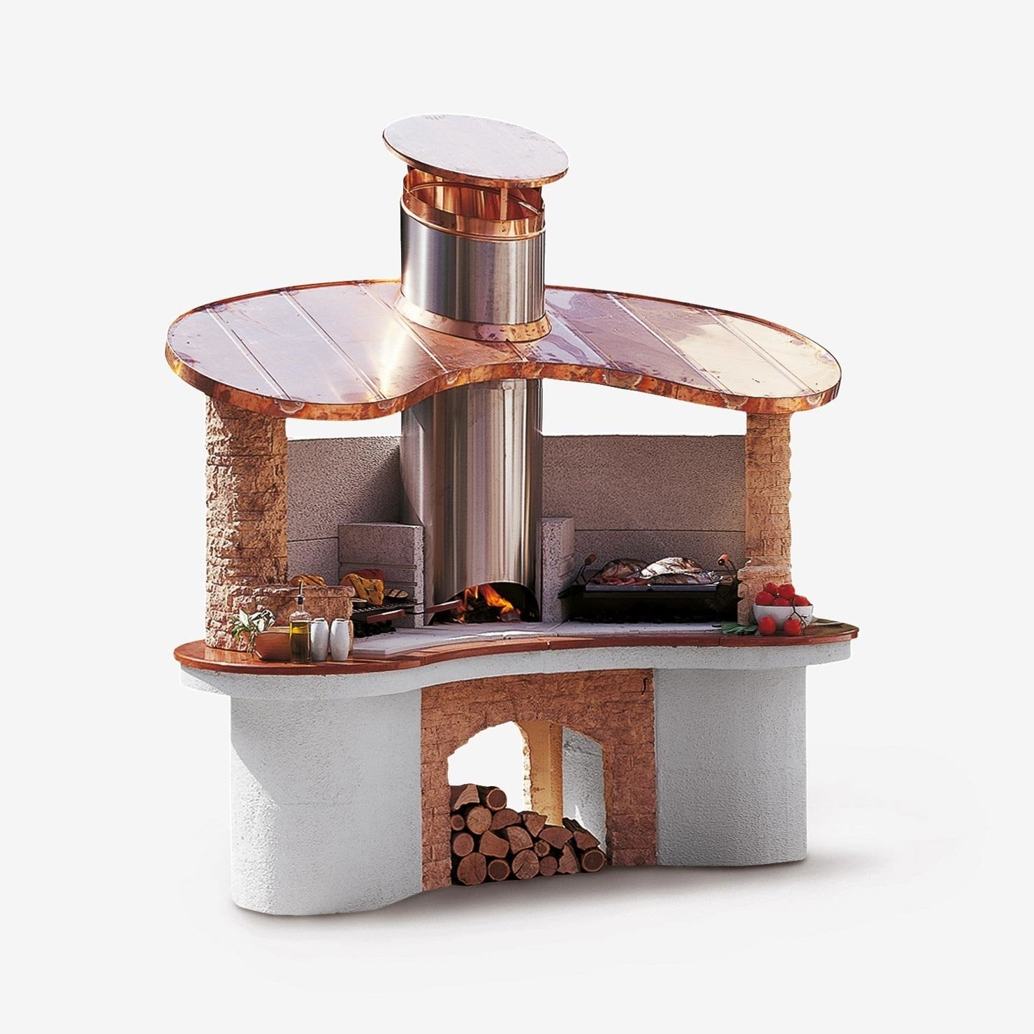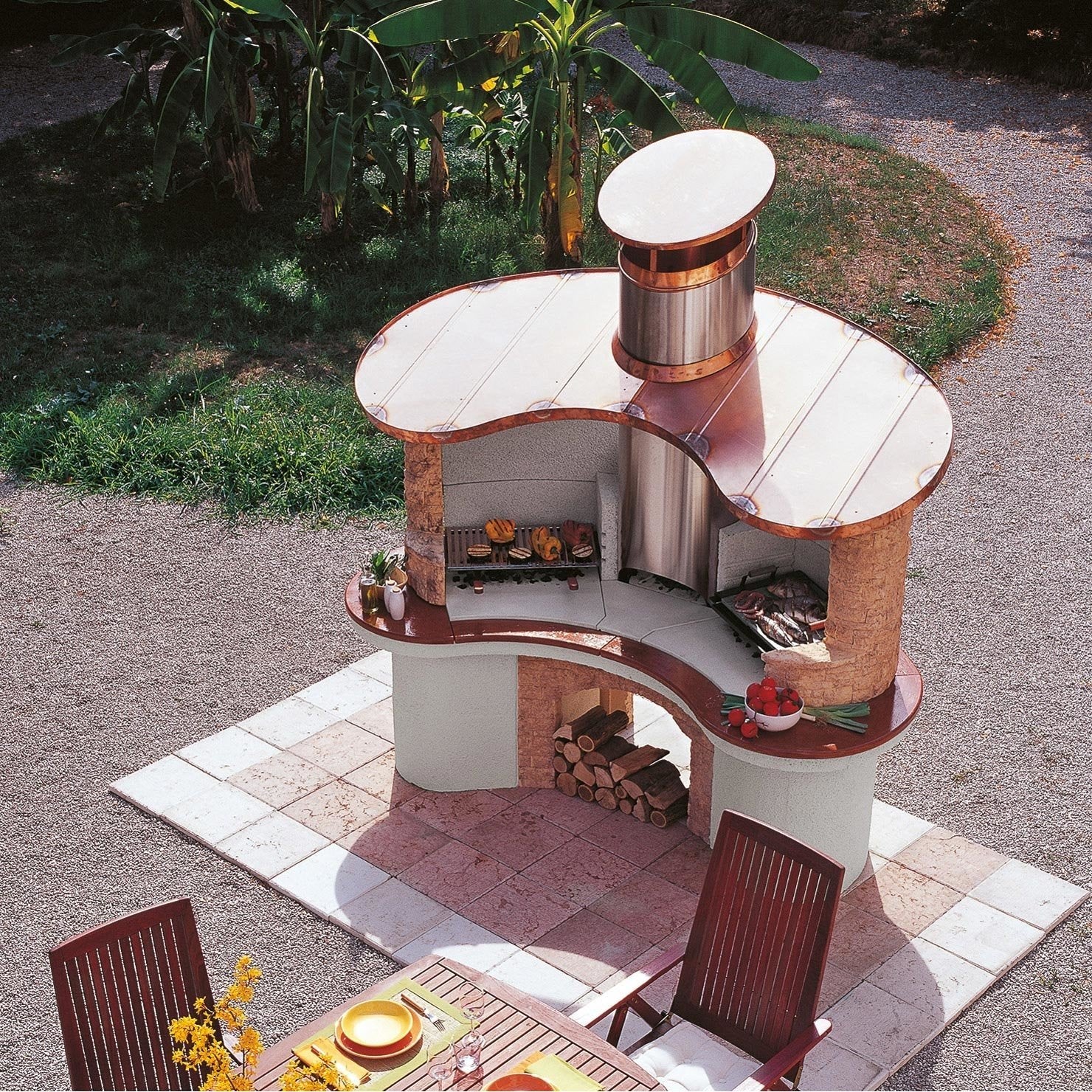 Palazzetti Sumatra barbecue con cappa in rame inserti in pietra e piano d'appoggio in Realstone cotto