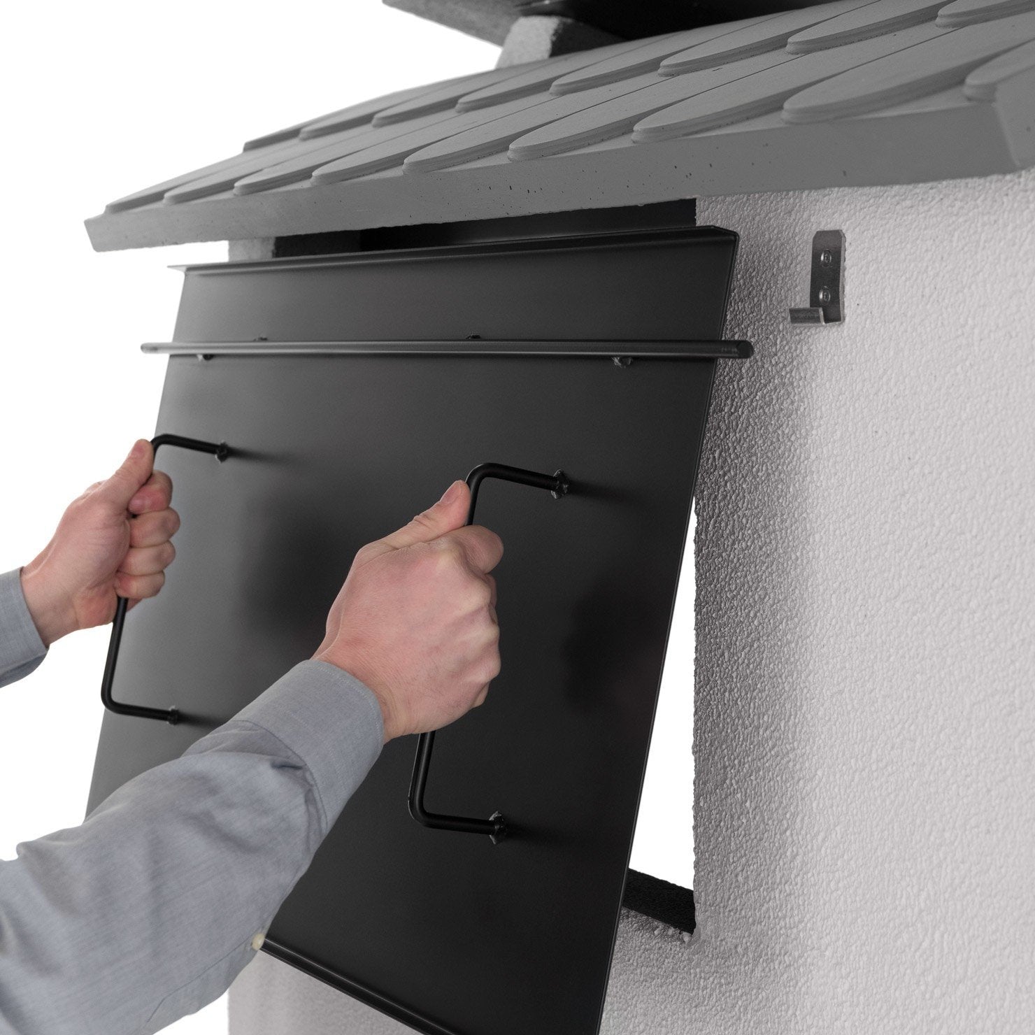 La tettoia del barbecue è realizzata con effetto tegola tinta antracite in Cemipiù, un materiale specifico per l'esterno resistente all'usura e agli agenti atmosferici.