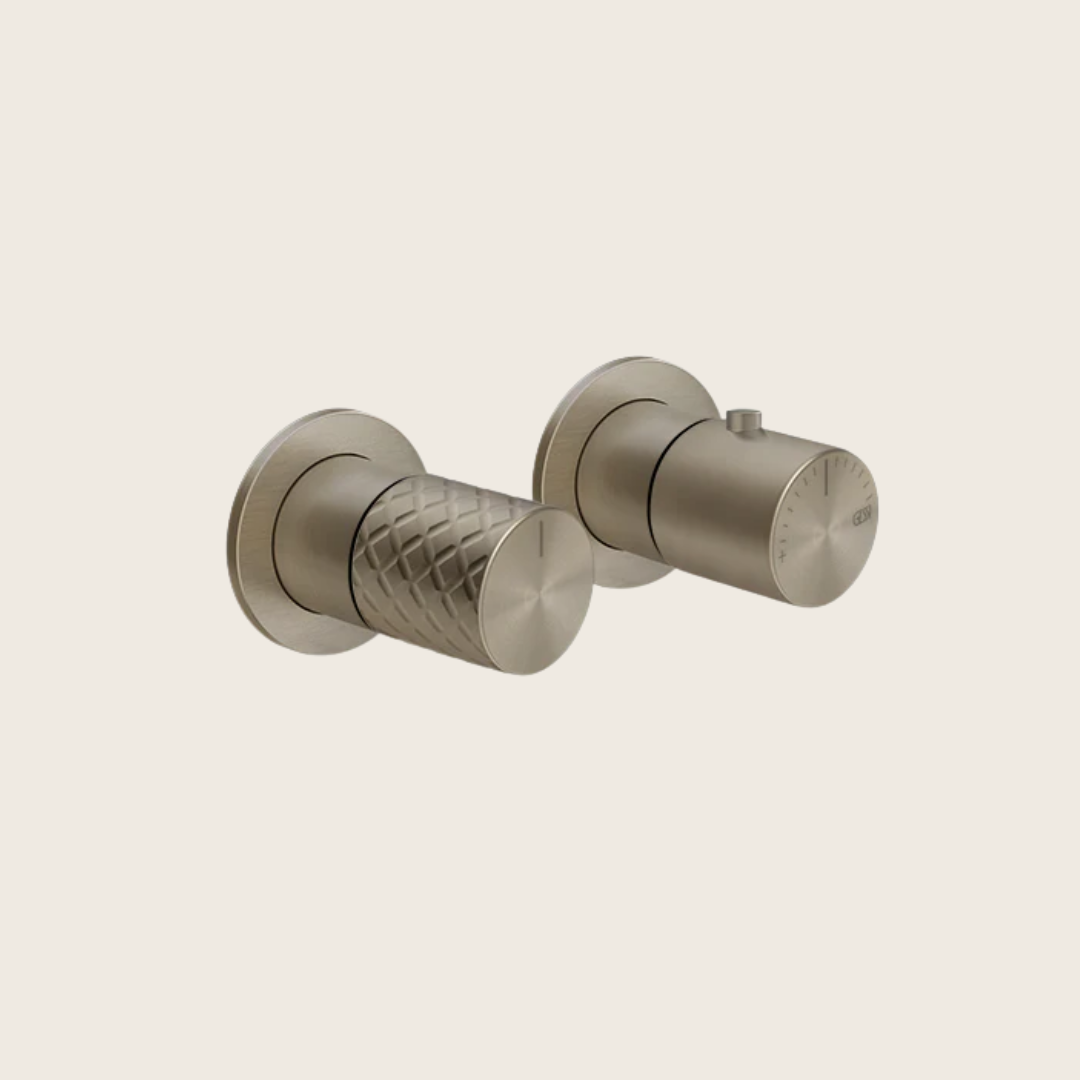 Il miscelatore termostatico per doccia a parete a due vie Gessi 70134, con la sua finitura brushed brass intreccio, è l'emblema di eleganza e funzionalità nel tuo bagno.