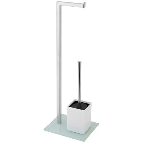 Piantana porta rotolo e portascopino in acciaio cromato con base in vetro temperato