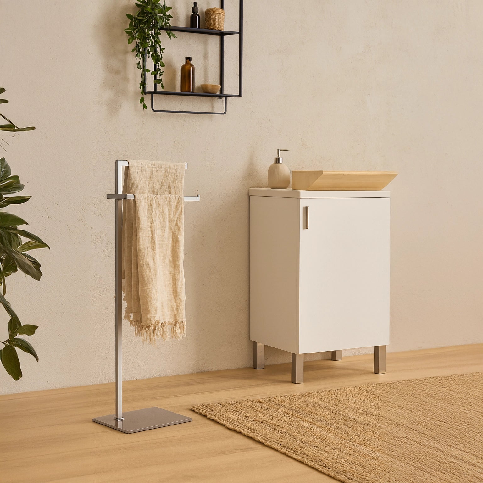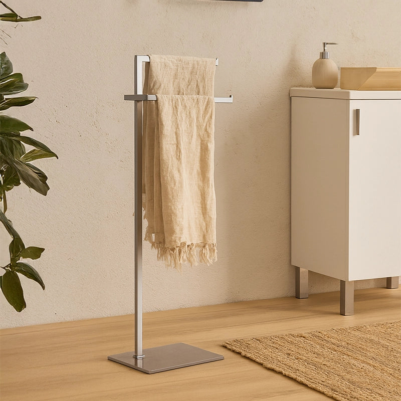 La piantana portasciugamani doppia dispone di due barre, perfette per appendere comodamente gli asciugamani. Le dimensioni di 28x20 cm la rendono adatta ad ogni tipo di bagno e di arredamento.