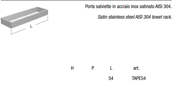 Realizzato in acciaio inox satinato, il porta asciugamani Tape54 garantisce durabilità e resistenza nel tempo. L'acciaio inox è noto per la sua capacità di resistere alla corrosione, agli urti e all’usura quotidiana, rendendo questo prodotto ideale per ambienti umidi come il bagno. La finitura satinata non solo aggiunge un tocco estetico elegante, ma facilita anche la pulizia e la manutenzione, mantenendo il porta asciugamani sempre impeccabile.