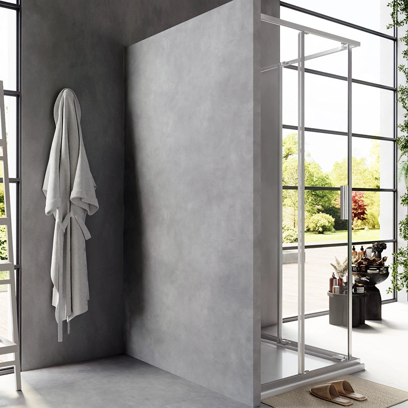 Realizzata con vetro temperato trasparente da 6 mm, alto 195 cm, dona luminosità all’ambiente e un senso di maggiore ampiezza.
