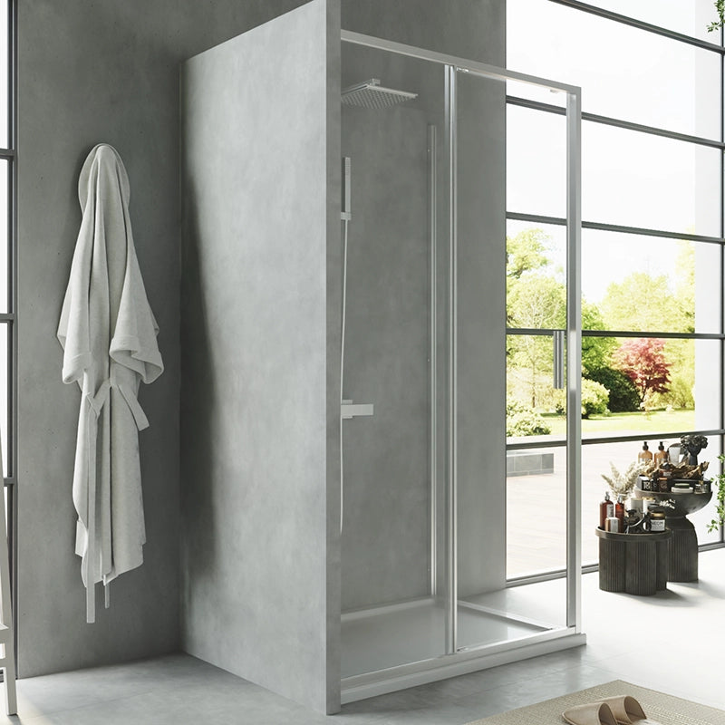 Realizzata con vetro temperato trasparente da 6 mm, alto 195 cm, dona luminosità all’ambiente e un senso di maggiore ampiezza.