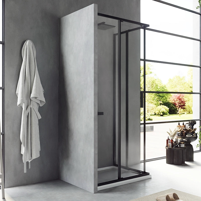 Realizzata con vetro temperato trasparente da 6 mm, alto 195 cm, dona luminosità all’ambiente e un senso di maggiore ampiezza.