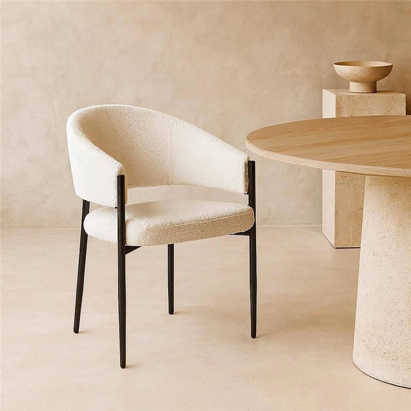Grazie al colore neutro ed elegante, questa sedia imbottita bouclé bianca è facilmente abbinabile con qualsiasi stile d'arredo: minimalista, moderno, scandinavo o contemporaneo. Perfetta per chi desidera un elemento chic, funzionale e versatile, capace di impreziosire con delicatezza gli ambienti interni.