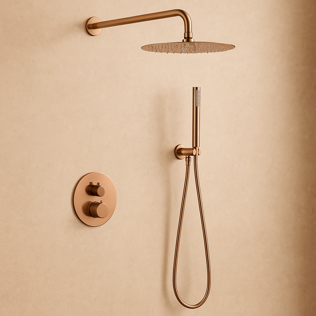 Questo set doccia termostatico da incasso in oro rosa spazzolato Melin è una soluzione sofisticata e completa per chi cerca un equilibrio perfetto tra estetica raffinata e prestazioni tecniche di alto livello. Ogni componente è progettato con materiali di qualità superiore e finiture pregiate, rendendolo ideale per bagni moderni e lussuosi.