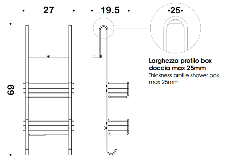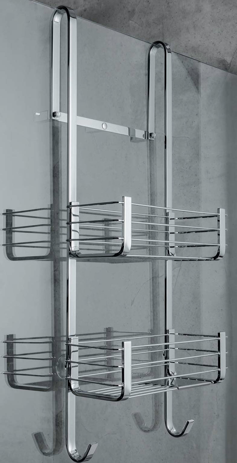 - Cavalletto Box Doccia: Supporto elegante e funzionale per il box doccia, progettato per offrire stabilità e durabilità. Il design in cromo si integra armoniosamente con gli altri elementi del set. Dotato di 3 appendini e due cestelli porta sapone.