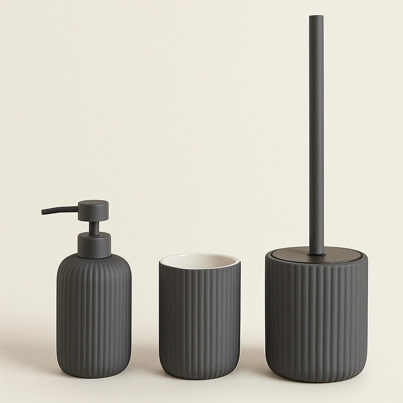 Realizzato in ceramica di alta qualità, questo set unisce resistenza e stile, donando al tuo bagno un aspetto sofisticato e ricercato. La tonalità grigio opaco si integra perfettamente in diversi stili d’arredo, dal moderno al classico, offrendo un tocco di raffinatezza che non passa mai di moda.