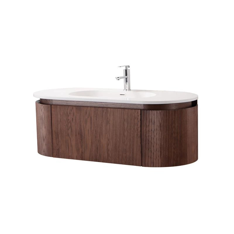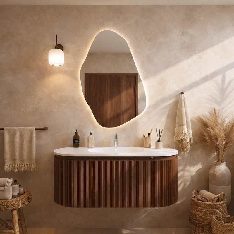 Il profilo curvo dialoga con bagni moderni e atmosfere naturali, creando continuità tra arredo e architettura. Il cannettato verticale aggiunge ritmo alle superfici, mentre il lavabo integrato rafforza lo stile minimale con un tocco sofisticato. Le proporzioni equilibrate rendono il mobile protagonista senza appesantire lo spazio.