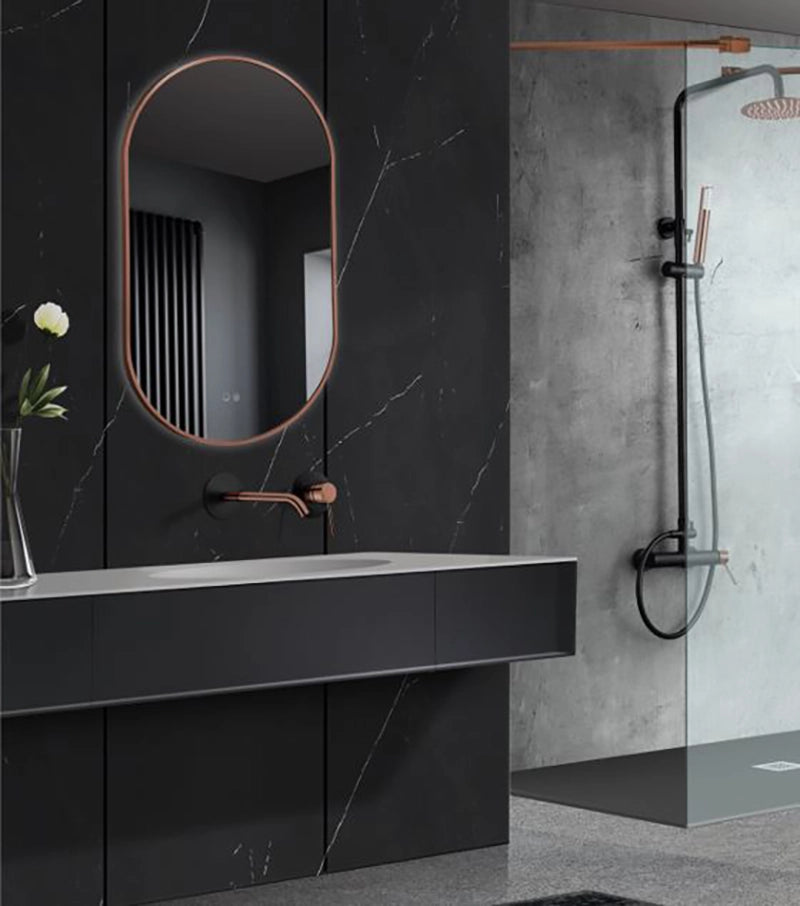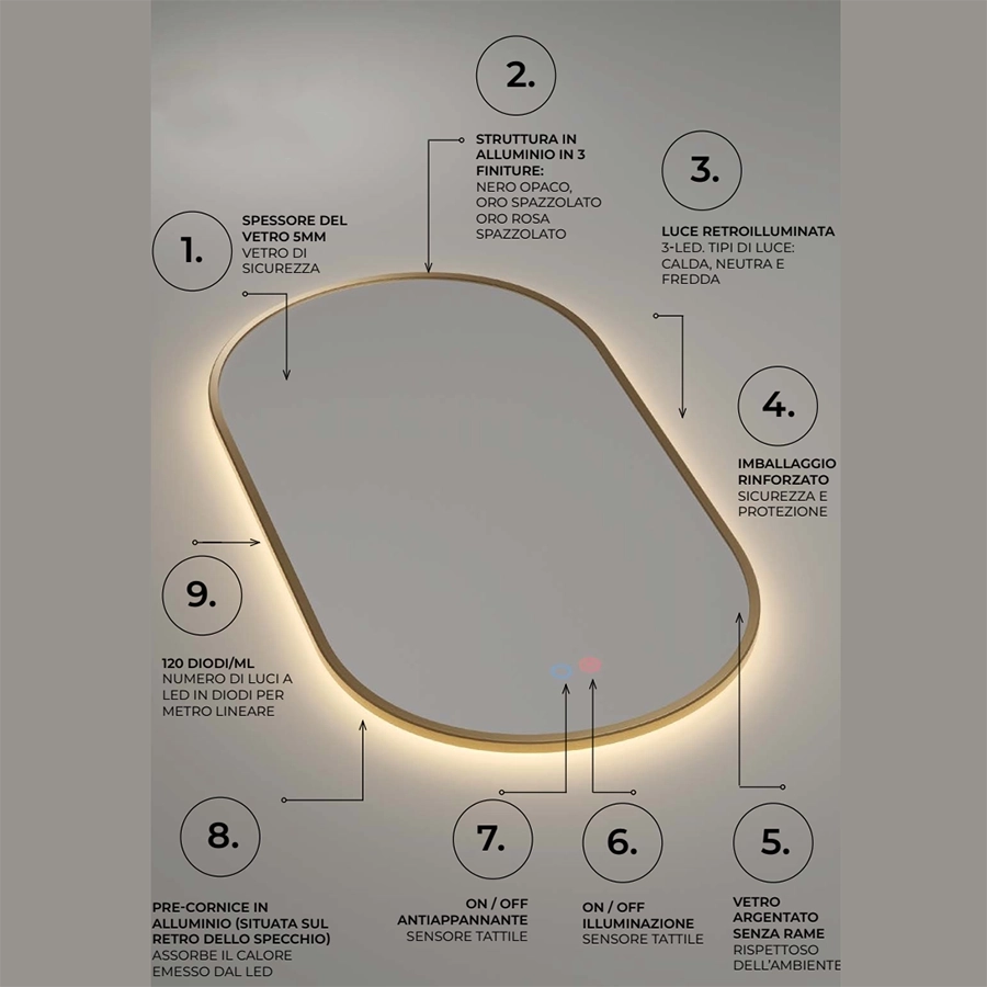 Lo specchio ellittico retroilluminato Pisa con pre-cornice in alluminio oro rosa spazzolato è la scelta perfetta per chi desidera un arredo bagno dal carattere sofisticato e contemporaneo. Le linee morbide e la finitura metallica donano all’ambiente un’eleganza senza tempo, creando un punto luce scenografico capace di impreziosire qualsiasi stile d’arredo, dal minimalista al moderno chic.