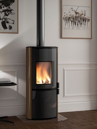 Il design arrotondato della stufa è valorizzato da un rivestimento in acciaio verniciato moka, che si combina armoniosamente con il top in ceramica per creare un effetto estetico di grande impatto. La porta fuoco verticale, dotata di un maniglione e un sistema di chiusura automatica, non solo garantisce un utilizzo sicuro e pratico, ma conferisce anche un tocco di modernità.