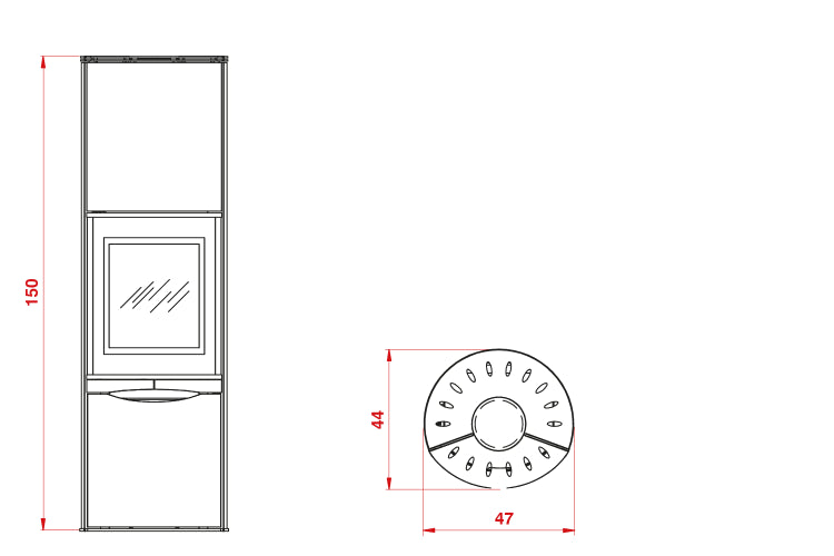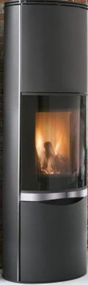La stufa è caratterizzata da una struttura ellittica in acciaio verniciato nero, con dettagli in acciaio cromato che aggiungono eleganza al suo aspetto. La portina in vetro ceramico stondato con maniglia a scomparsa non solo garantisce sicurezza e praticità, ma permette anche una visione chiara e suggestiva del fuoco, contribuendo a creare un’atmosfera accogliente.