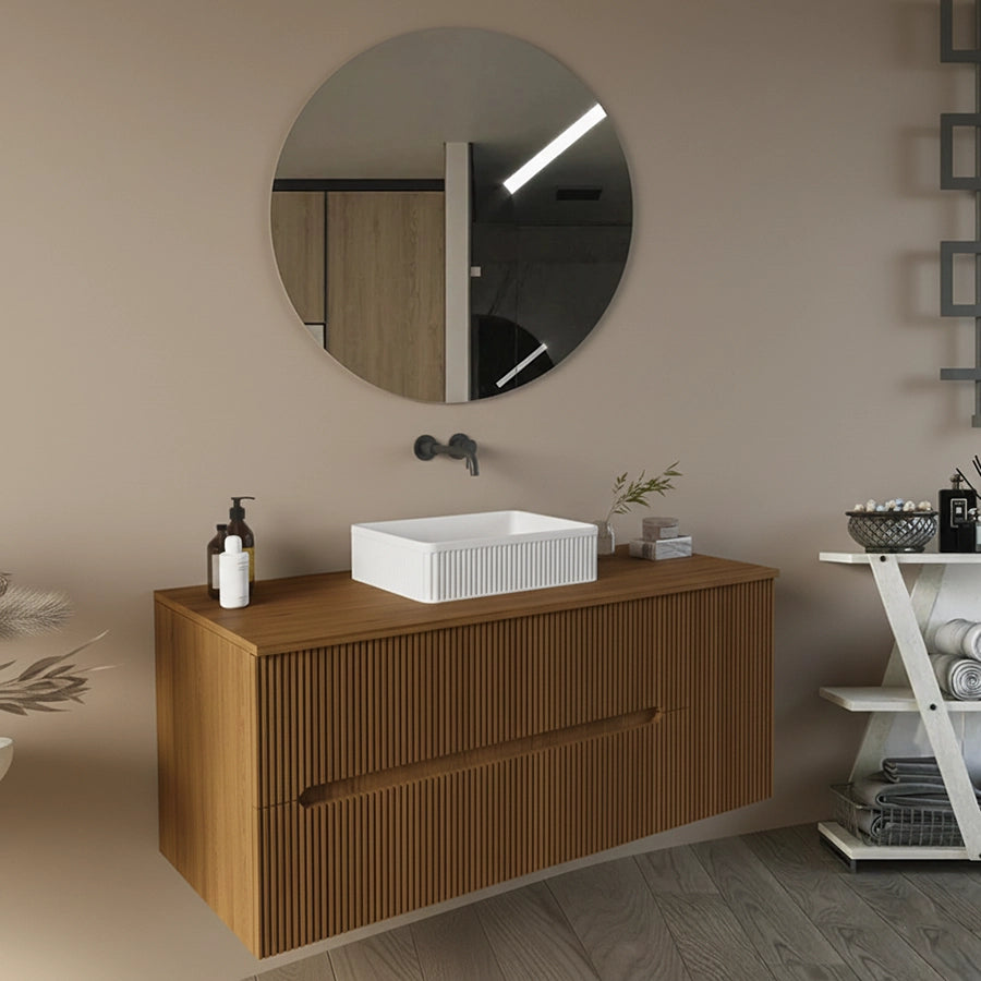 Il mobile bagno Urbino 100 cm rappresenta l'incontro perfetto tra modernità e praticità. Realizzato in una sofisticata finitura cannettata, nella ricercata nuance noce chiaro, si distingue per una composizione intelligente degli spazi interni. La base da 70 cm include 2 cassetti ideali per organizzare con facilità e discrezione tutti i tuoi accessori per la cura personale.