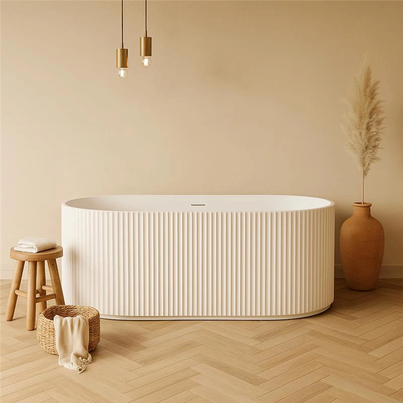 La vasca freestanding Jeorgia 170x80 cm con altezza 58 cm si distingue per il suo innovativo rivestimento cannettato in acrilico bianco opaco, che dona un tocco contemporaneo e sofisticato all’ambiente bagno. Le linee verticali scolpite sulla superficie aggiungono movimento visivo, trasformando la vasca in un autentico elemento di design.
