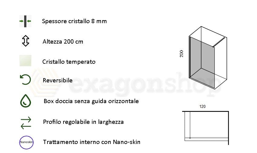 - Applicazione Nanoskin: un trattamento speciale applicato all'interno del vetro che rende la parete doccia più resistente allo sporco e più facile da pulire.