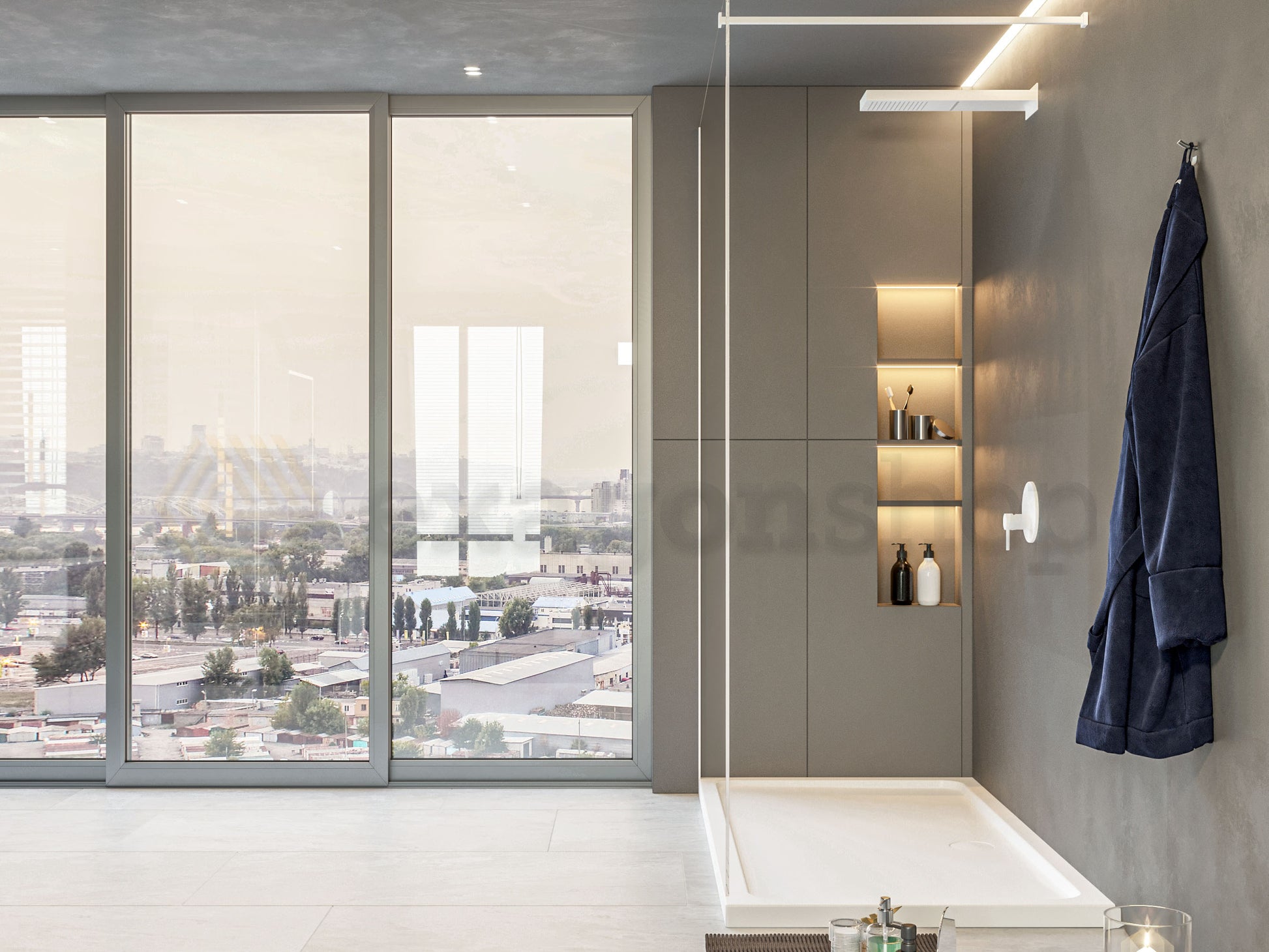 La parete doccia fissa della serie WALK IN è una soluzione elegante e funzionale per creare una doccia a filo pavimento.
